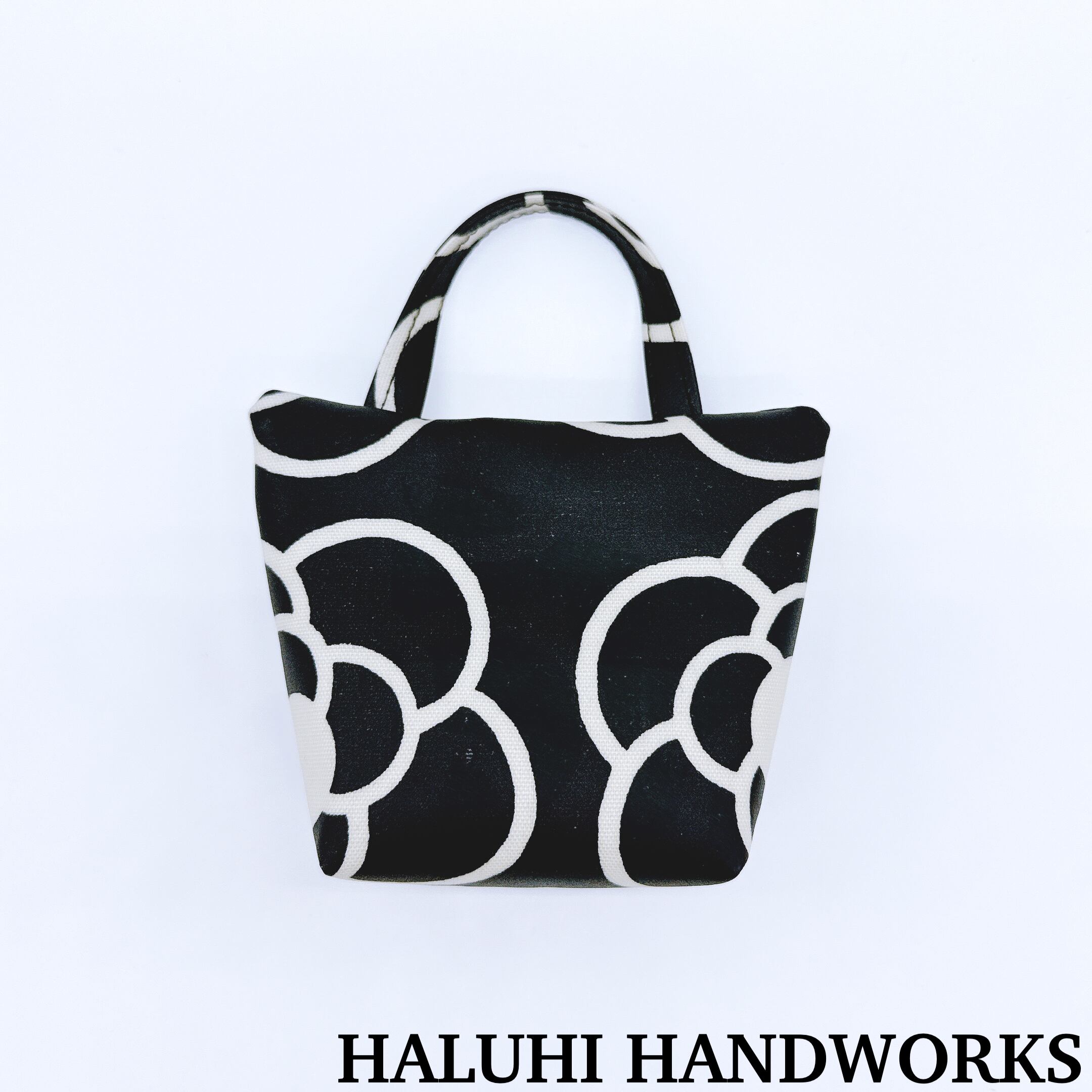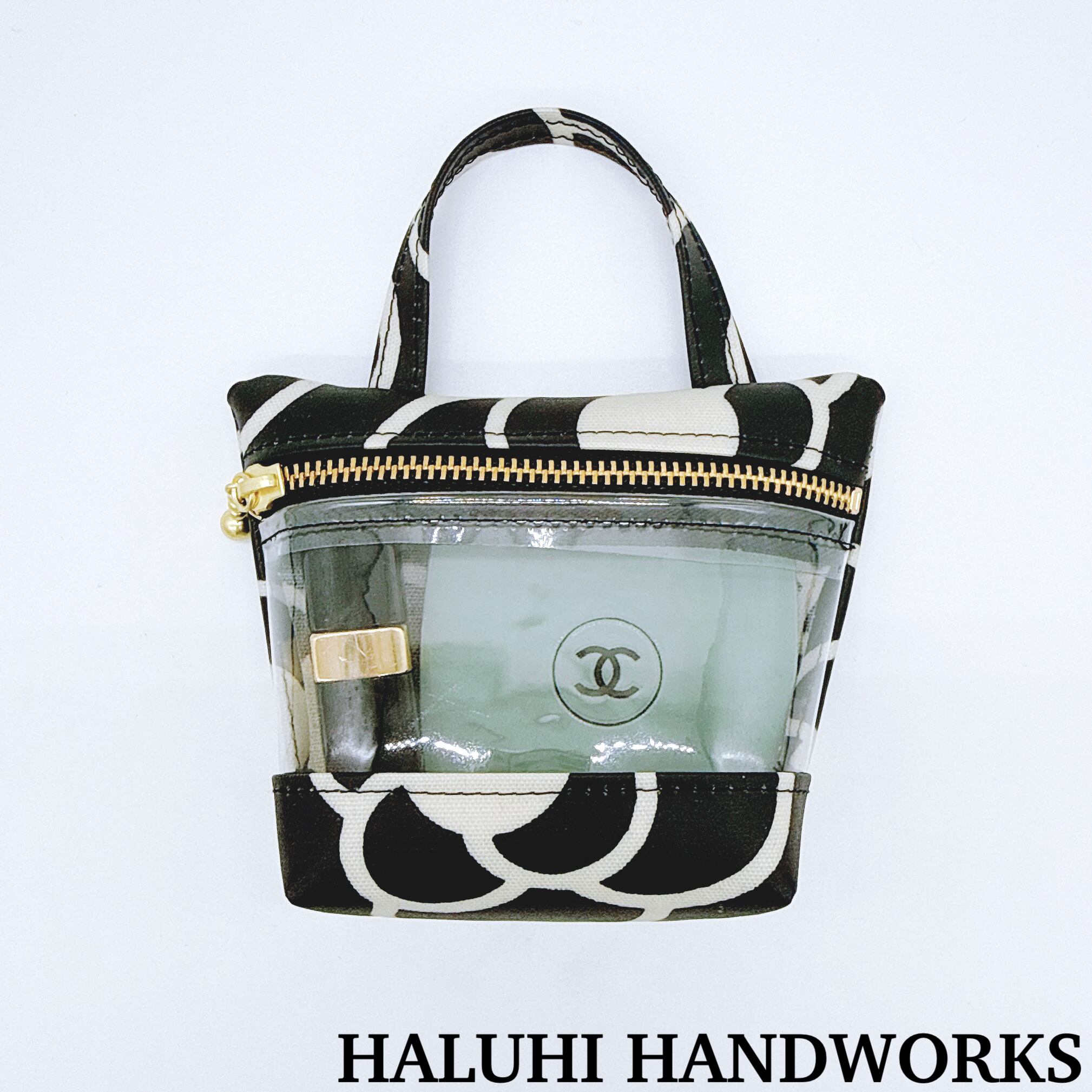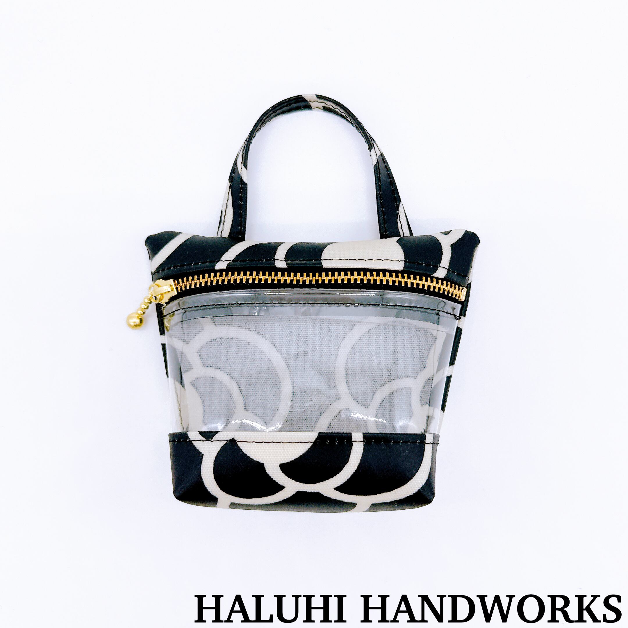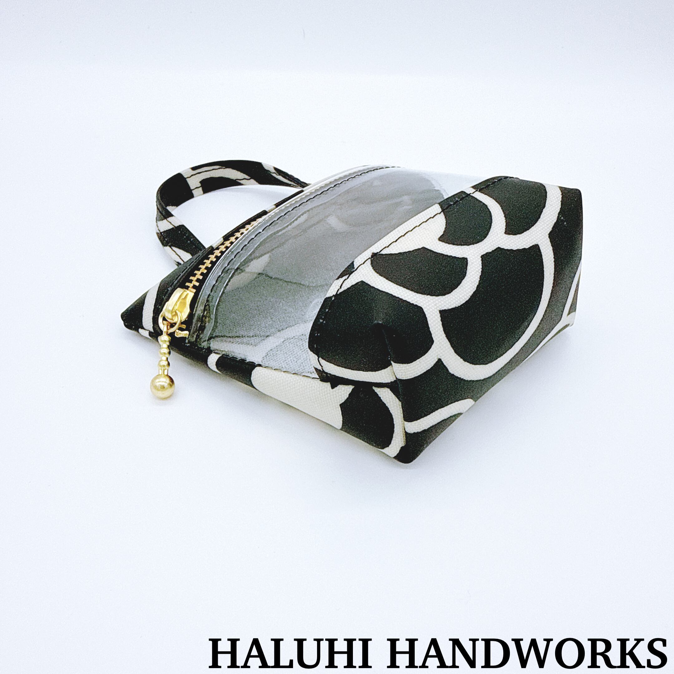 カメリア柄が大人かわいい、ラミネート生地×クリアポケットのぷっくりミニミニポーチです。