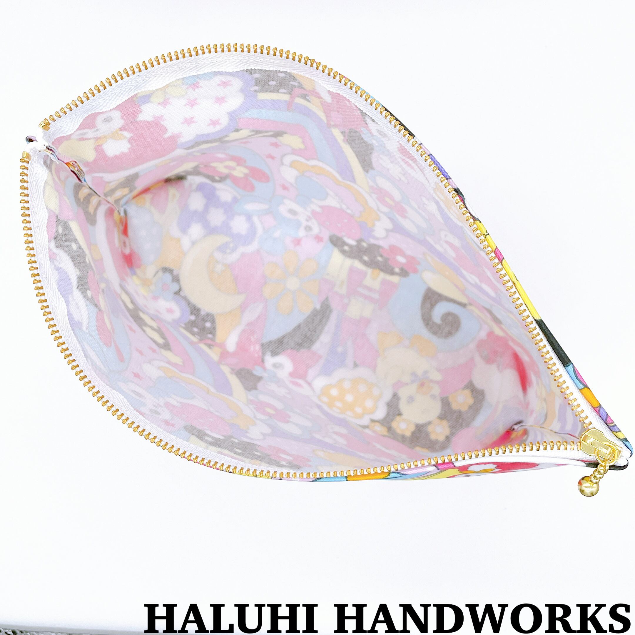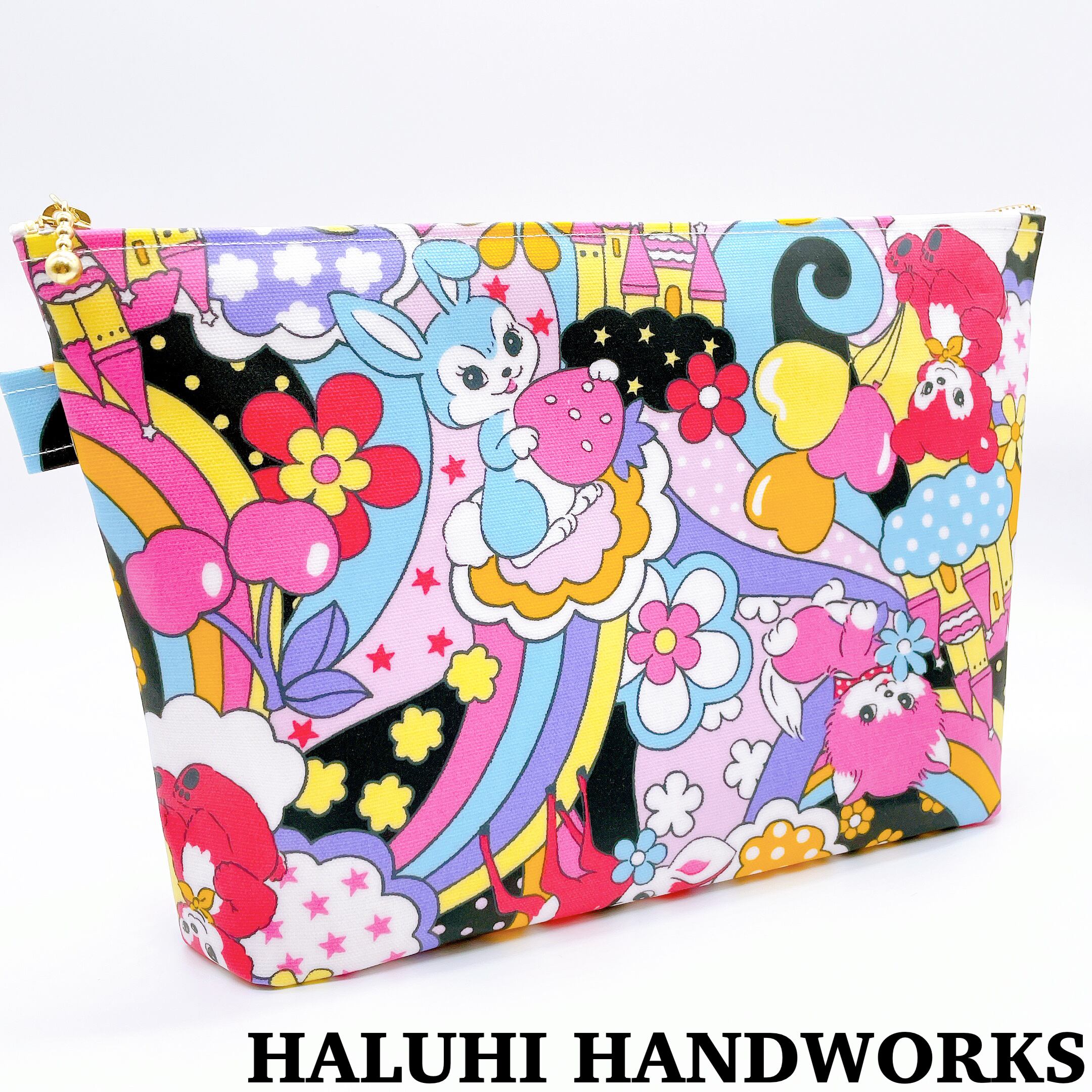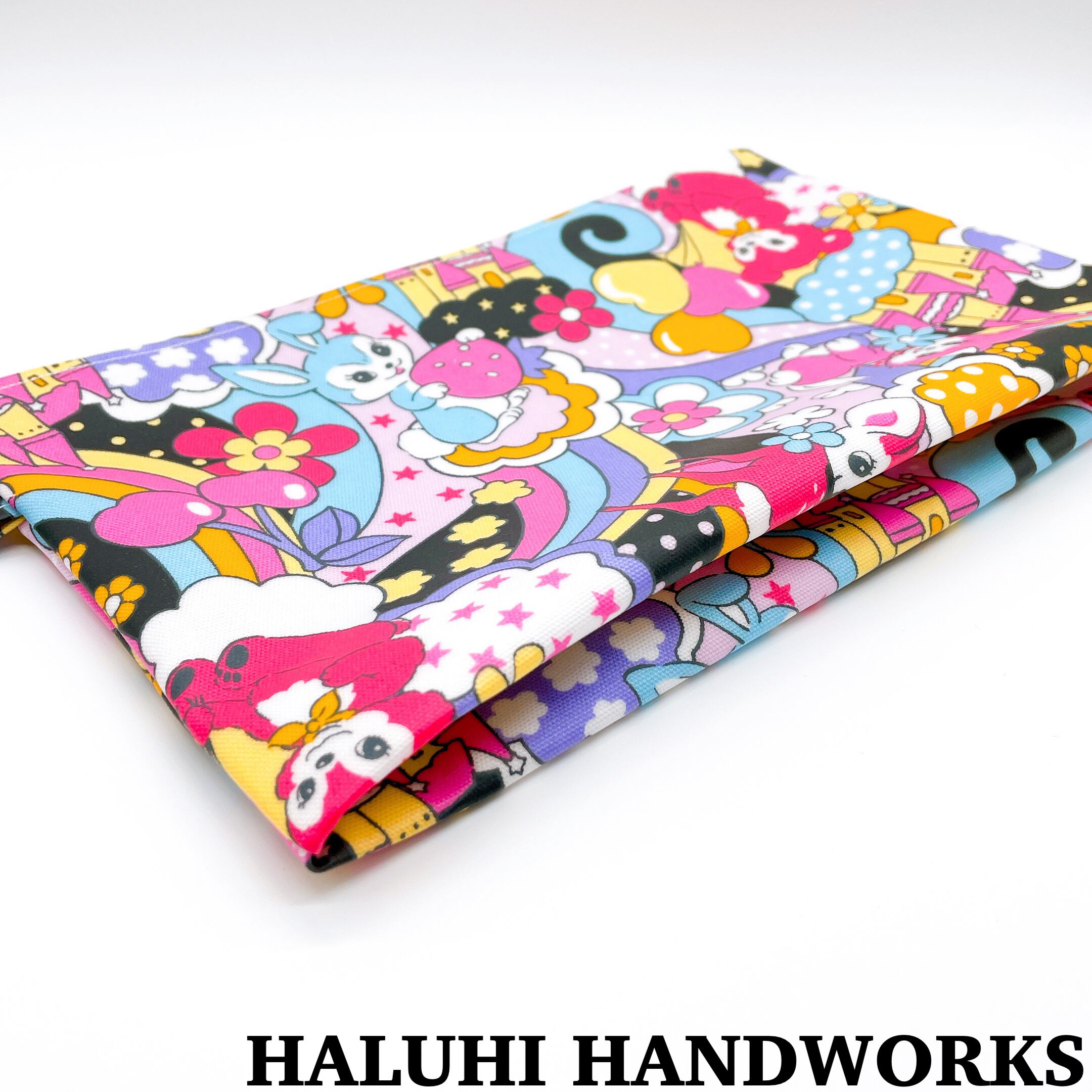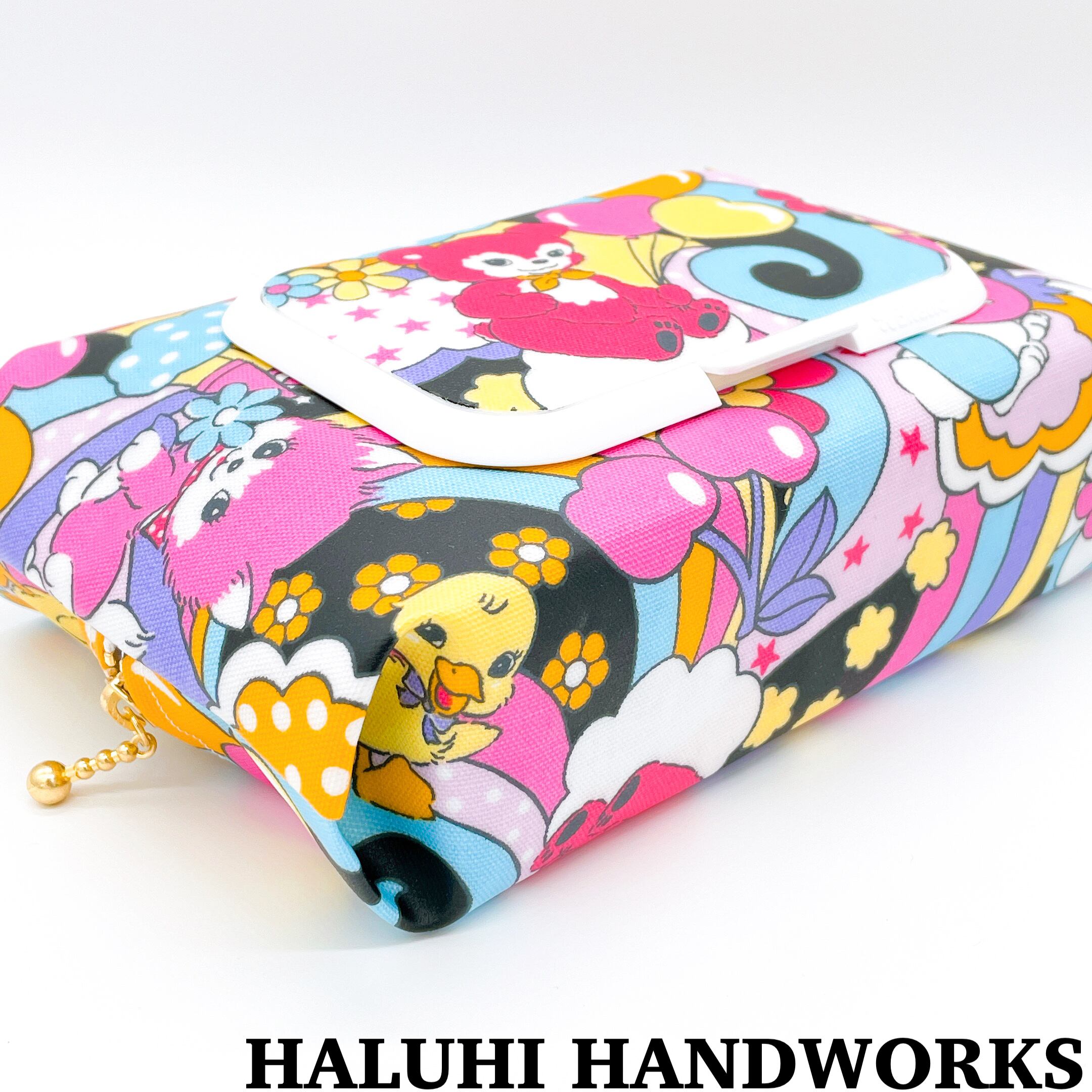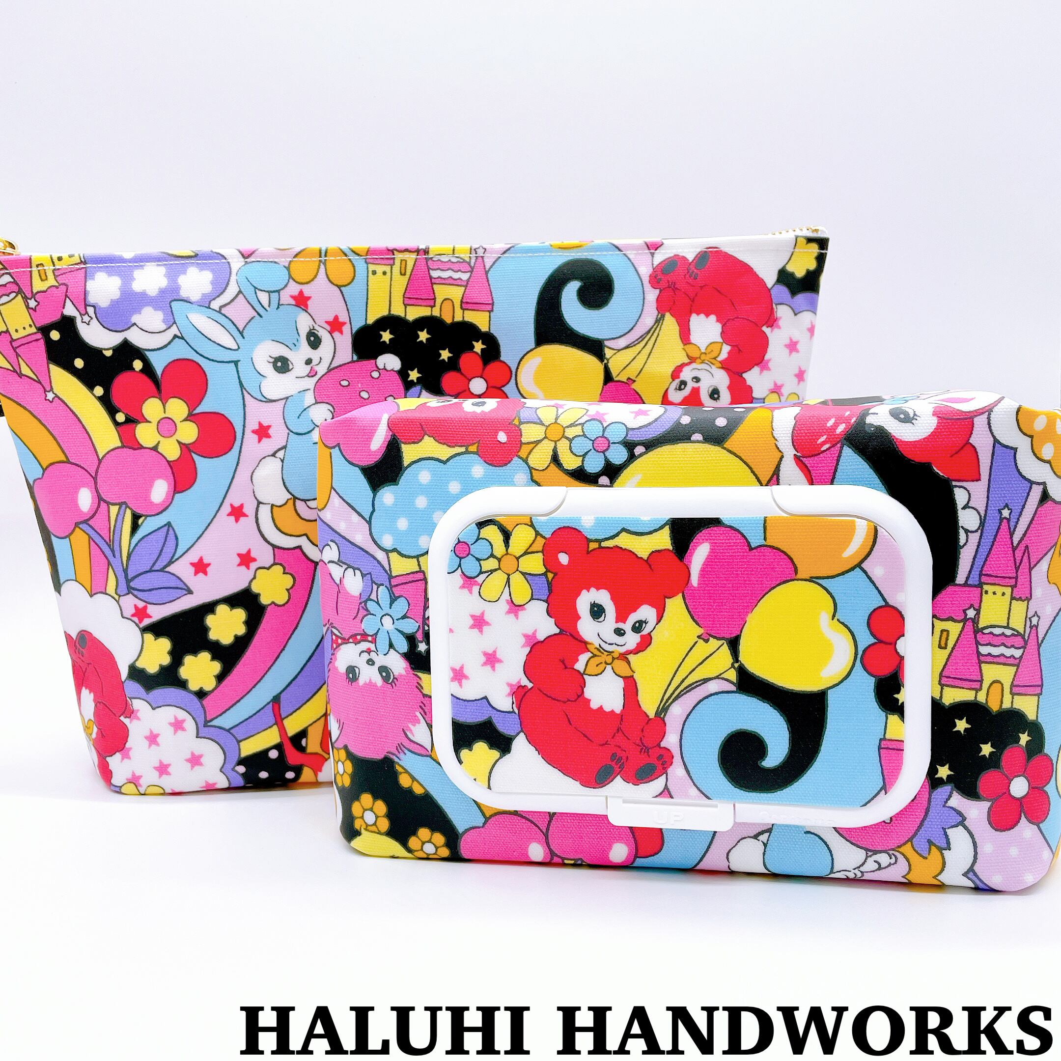 女の子が大好きなモチーフがたくさん詰まった、とってもかわいいファンシーアニマルのラミネート生地で作ったおしりふきポーチとオムツポーチのセットになります。