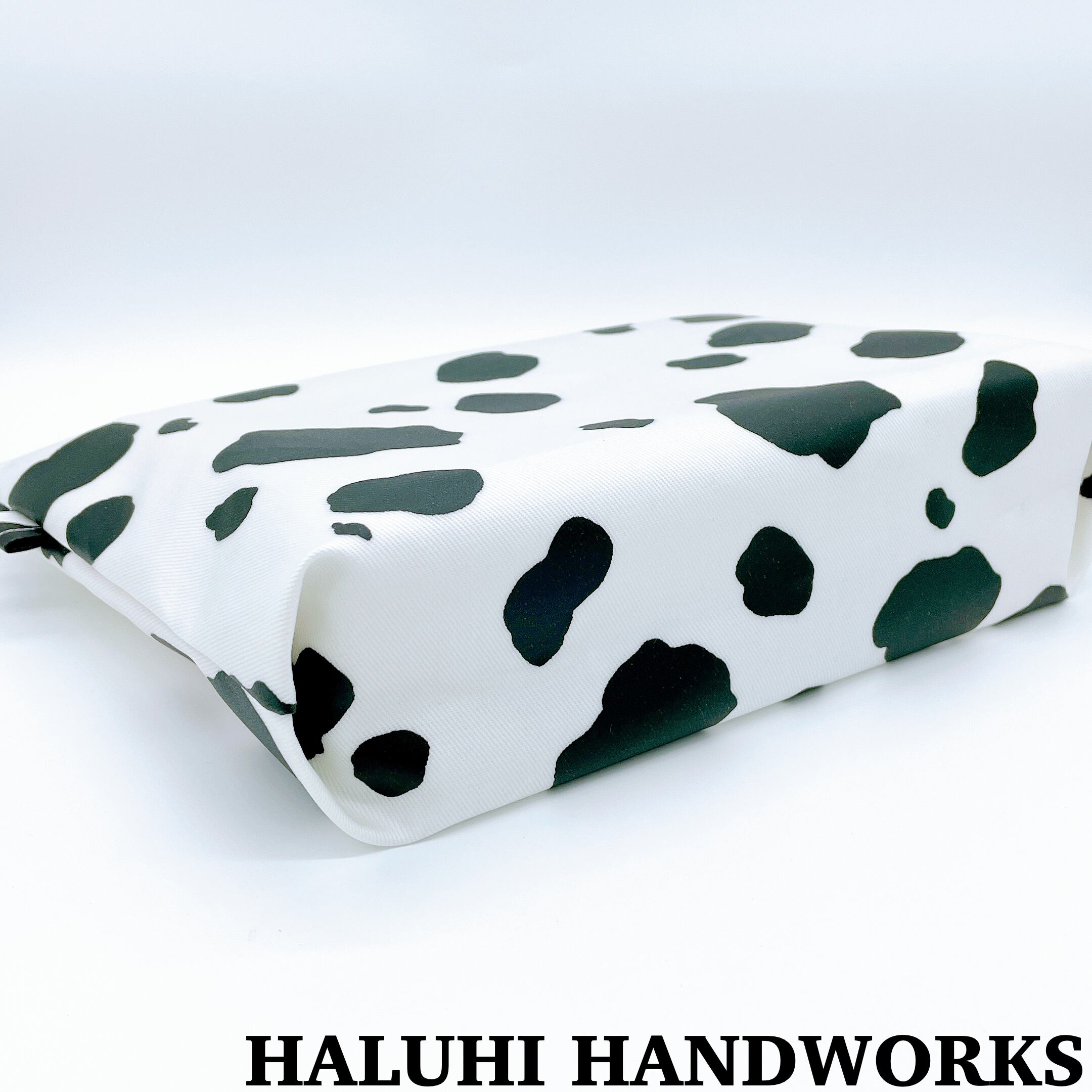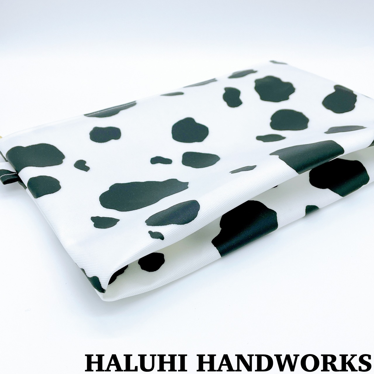 牛柄、ホルスタイン柄、ダルメシアン柄のラミネート生地で作った折りマチポーチになります。
