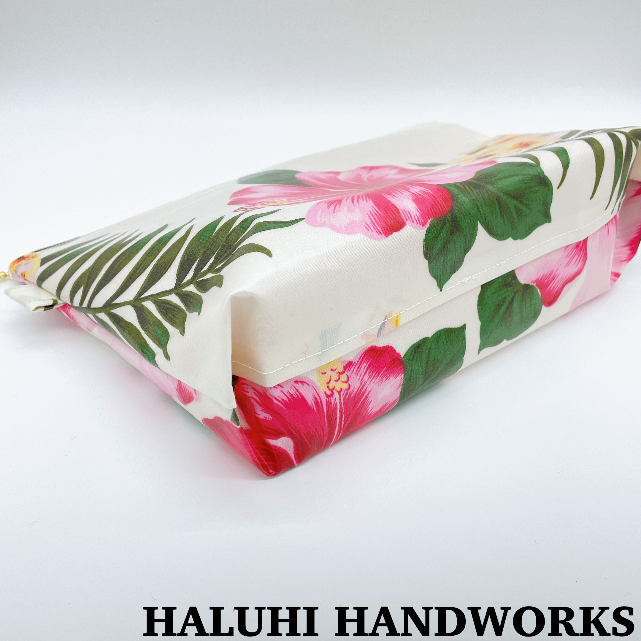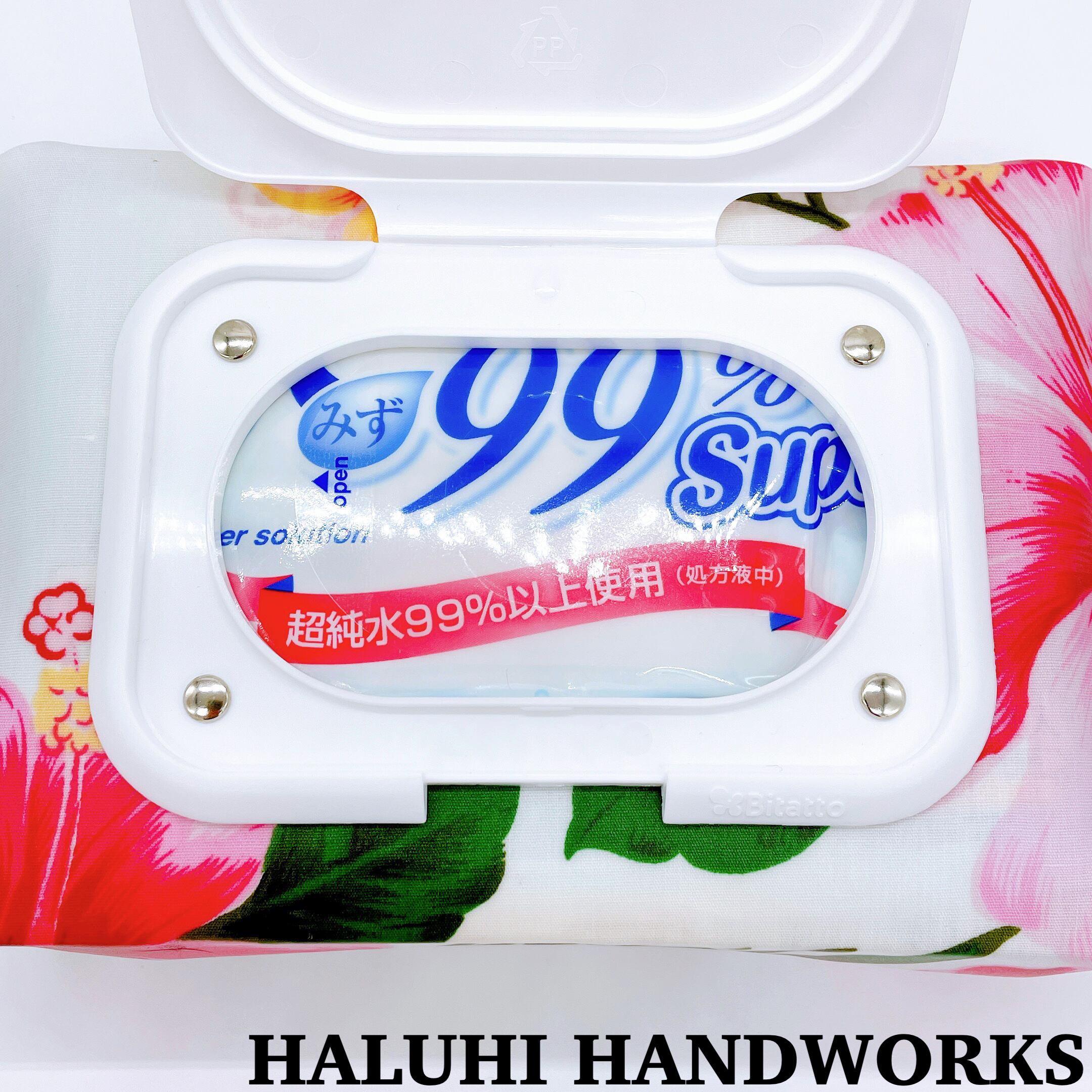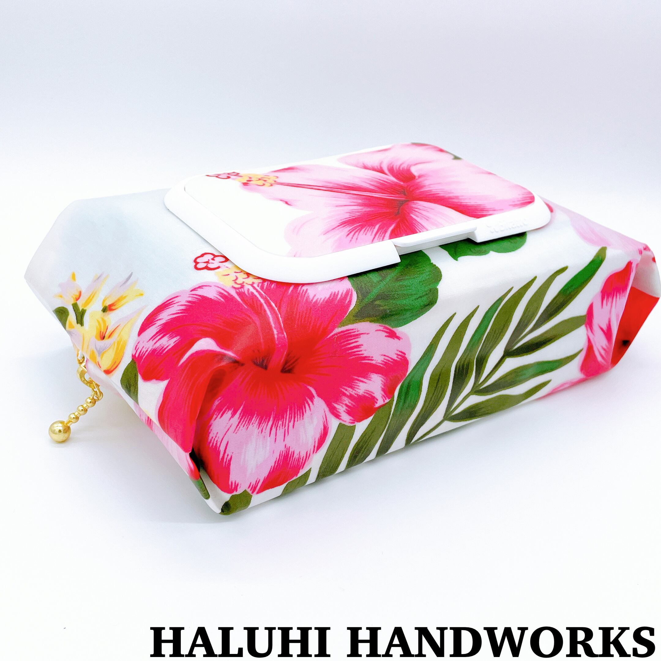 ハワイアンハイビスカスのラミネート生地で作ったおしりふきポーチとオムツポーチのセットになります。