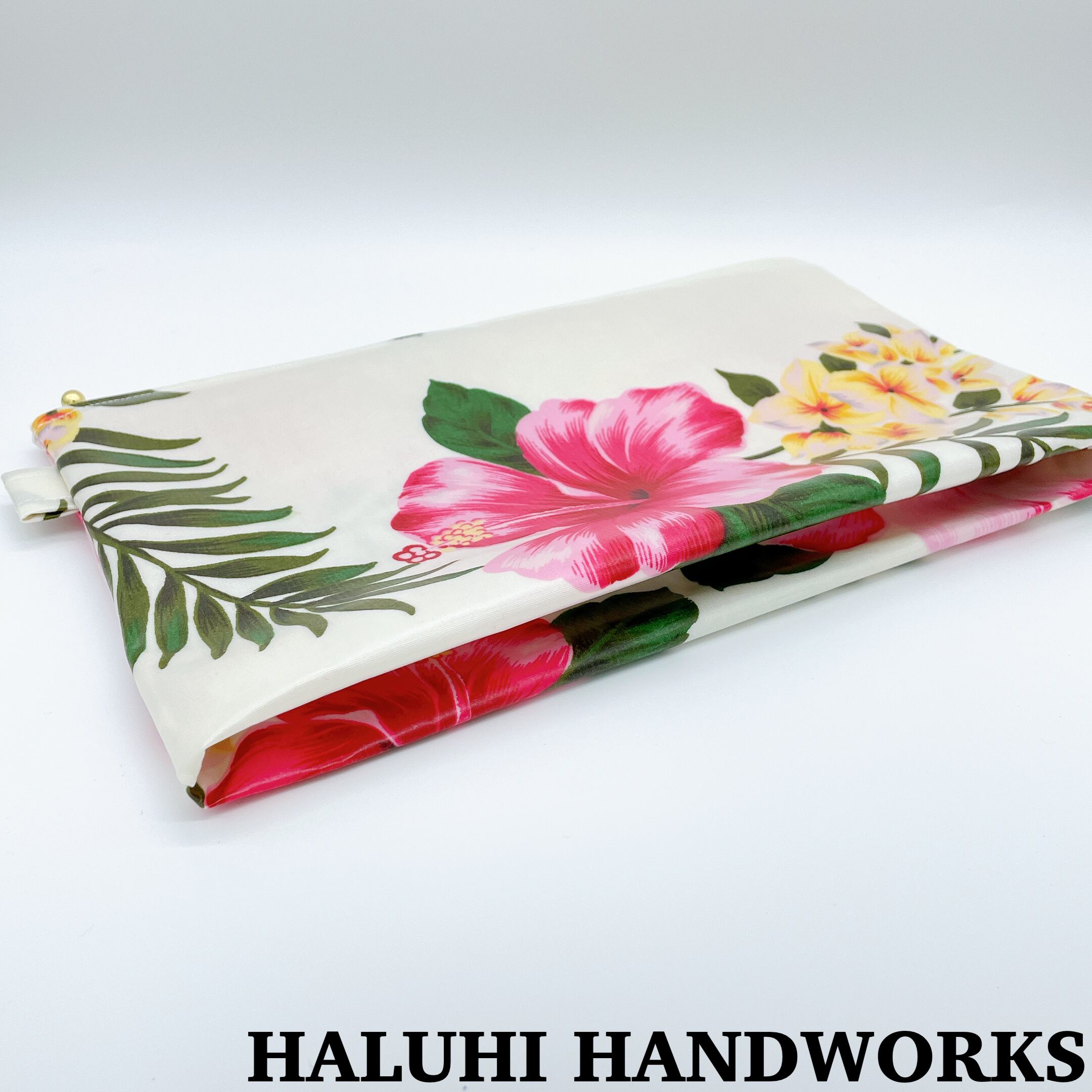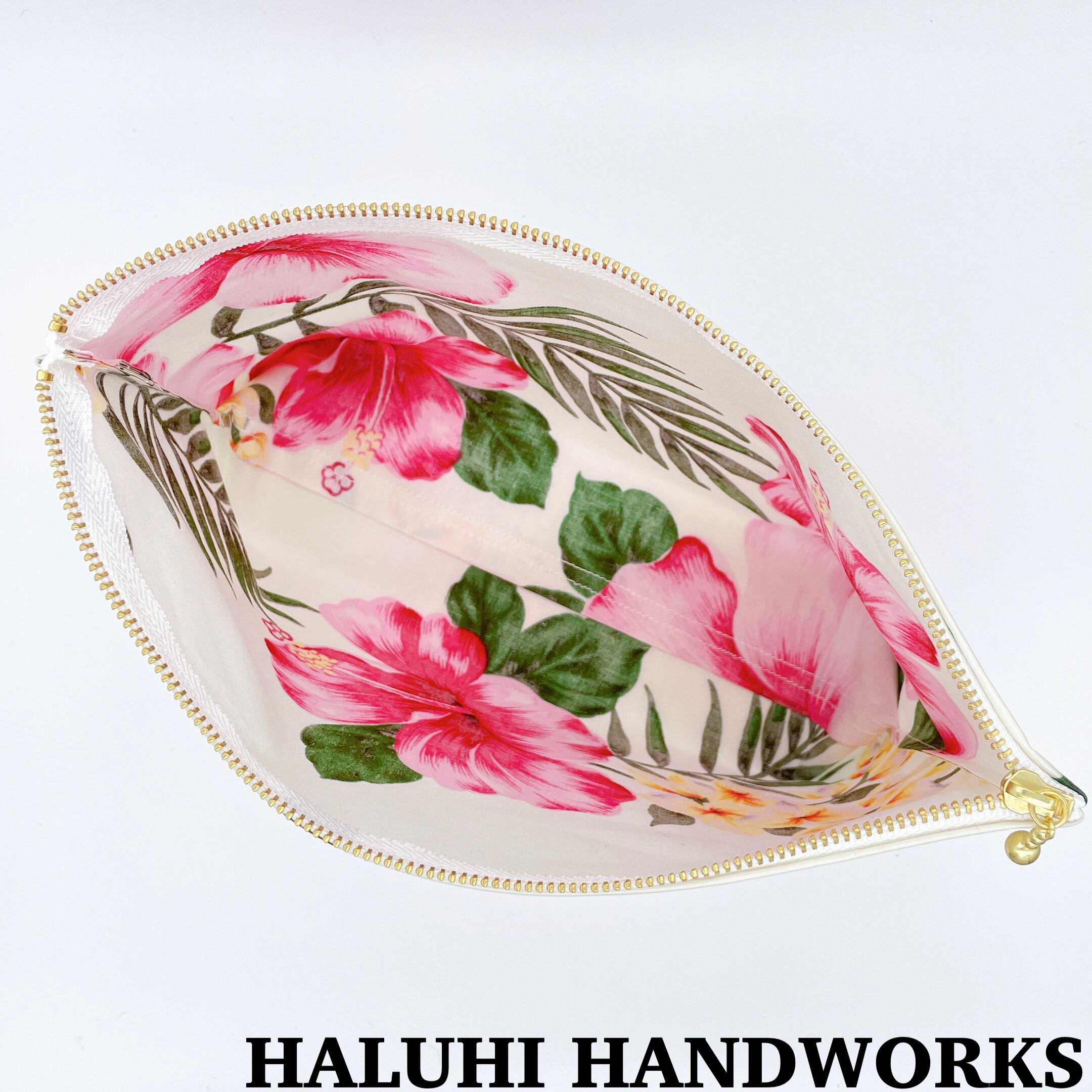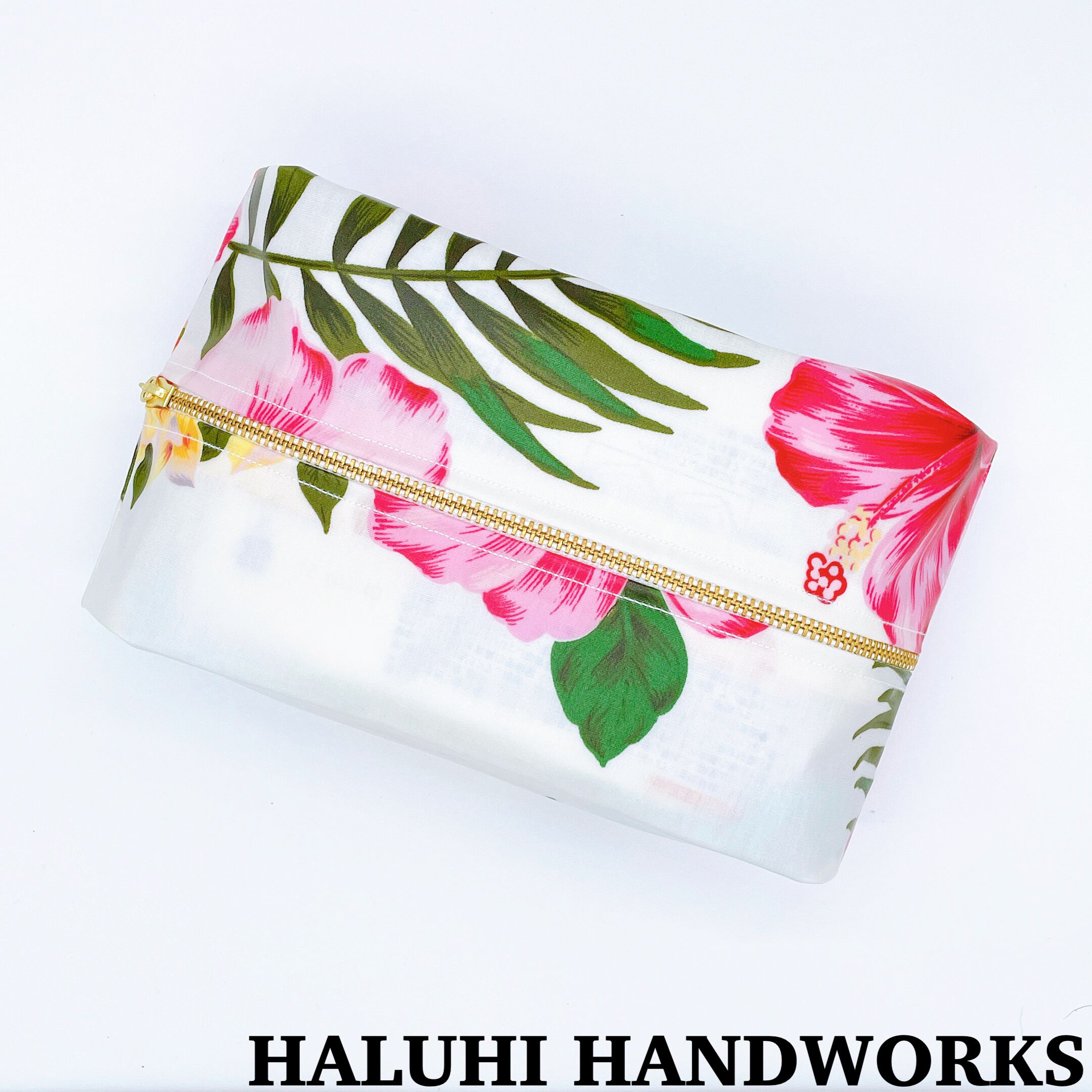ハワイアンハイビスカスのラミネート生地で作ったおしりふきポーチとオムツポーチのセットになります。