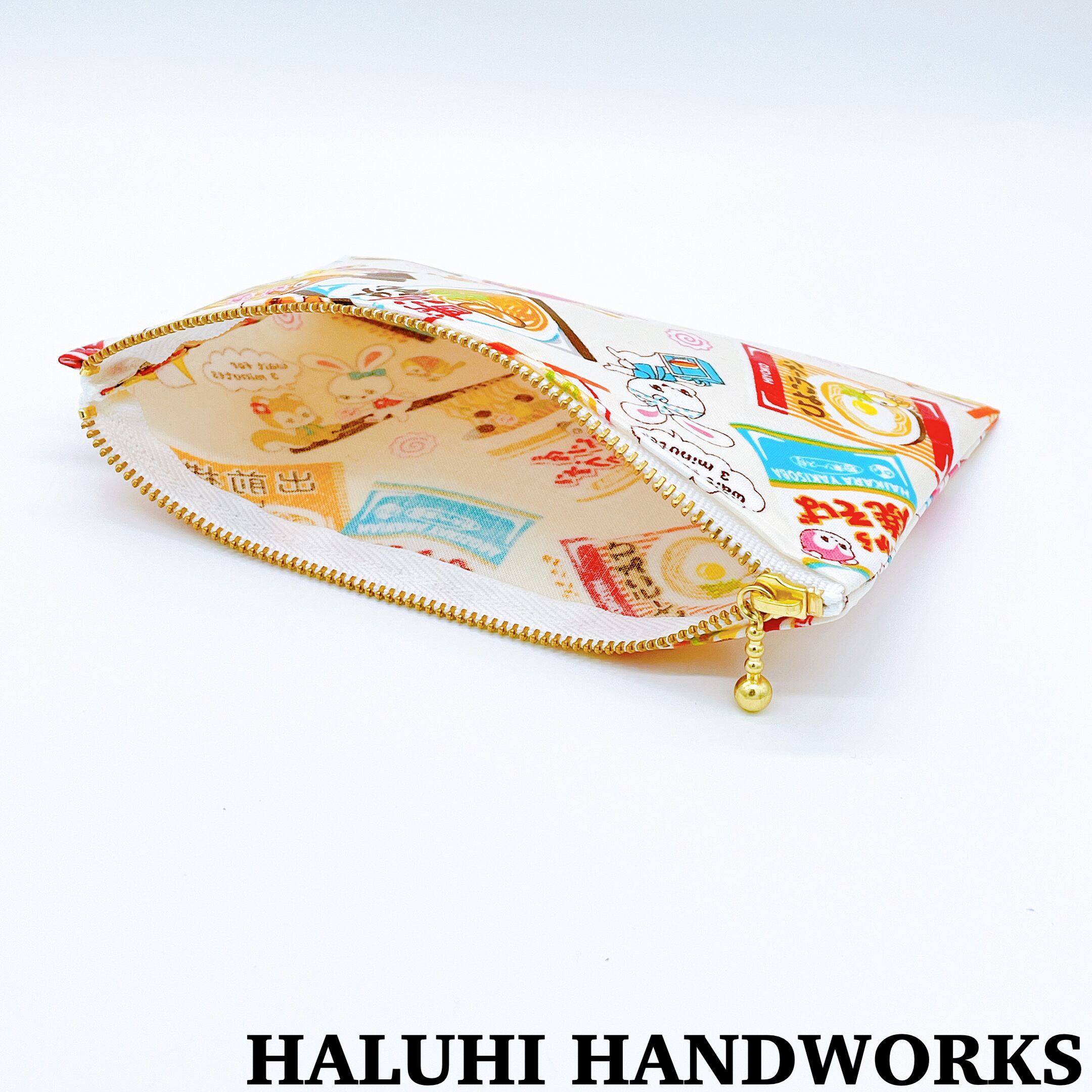 可愛くて、楽しくて、美味しそうな、はいから横丁のラミネート生地で作ったフラットポーチになります。