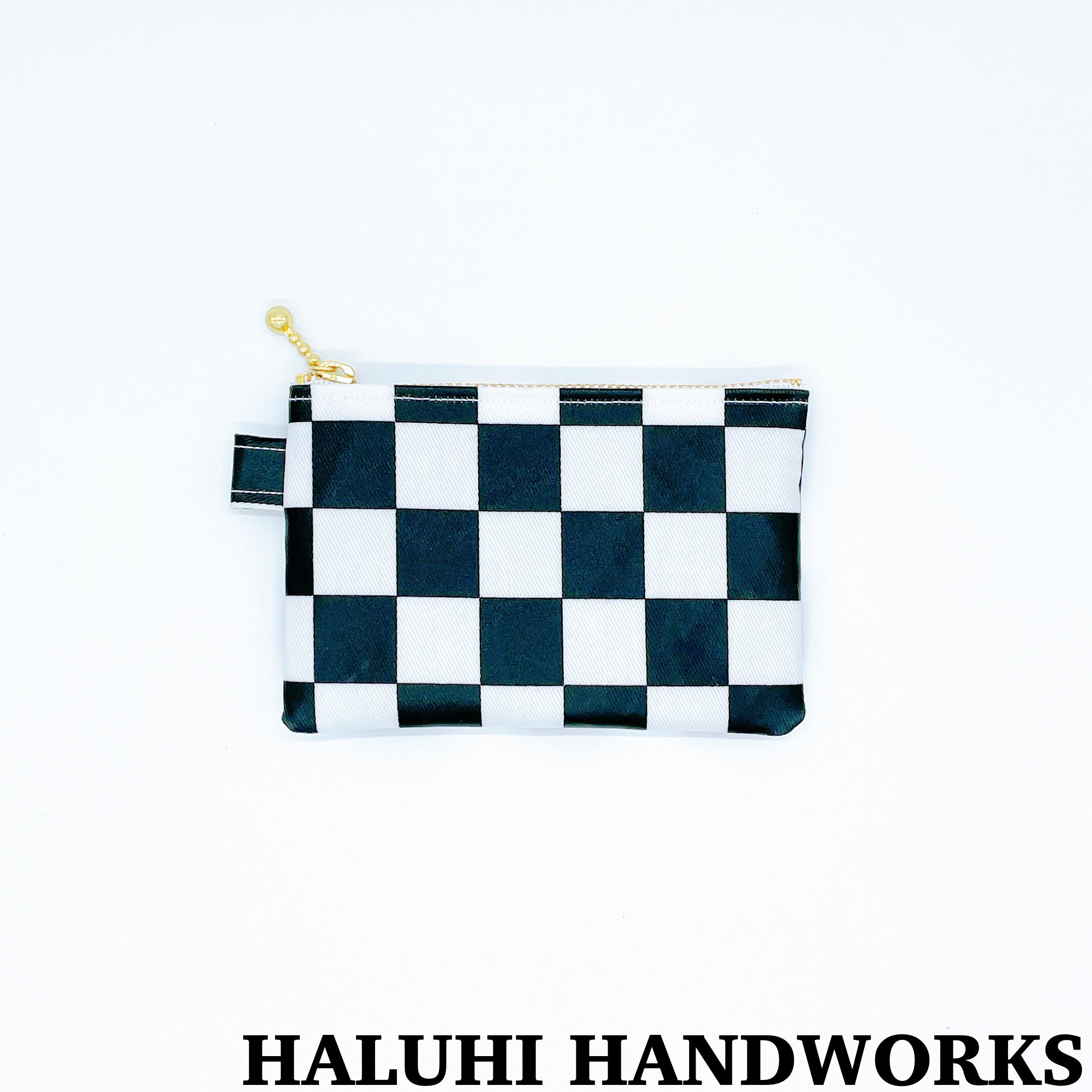 チェッカーフラッグのラミネート生地で作ったミニポーチになります。シンプルなデザインで男性も女性もお使い頂けるミニポーチです☻