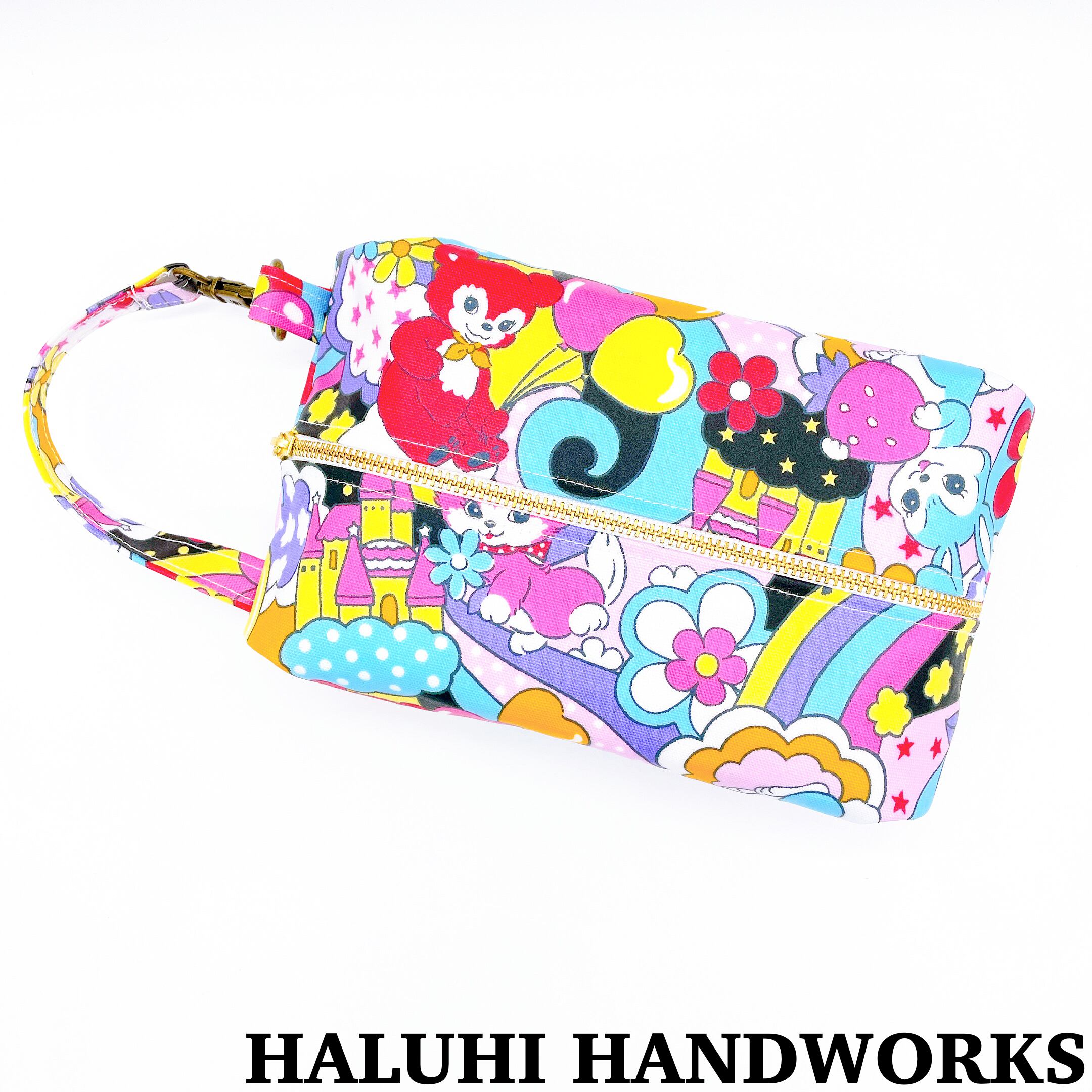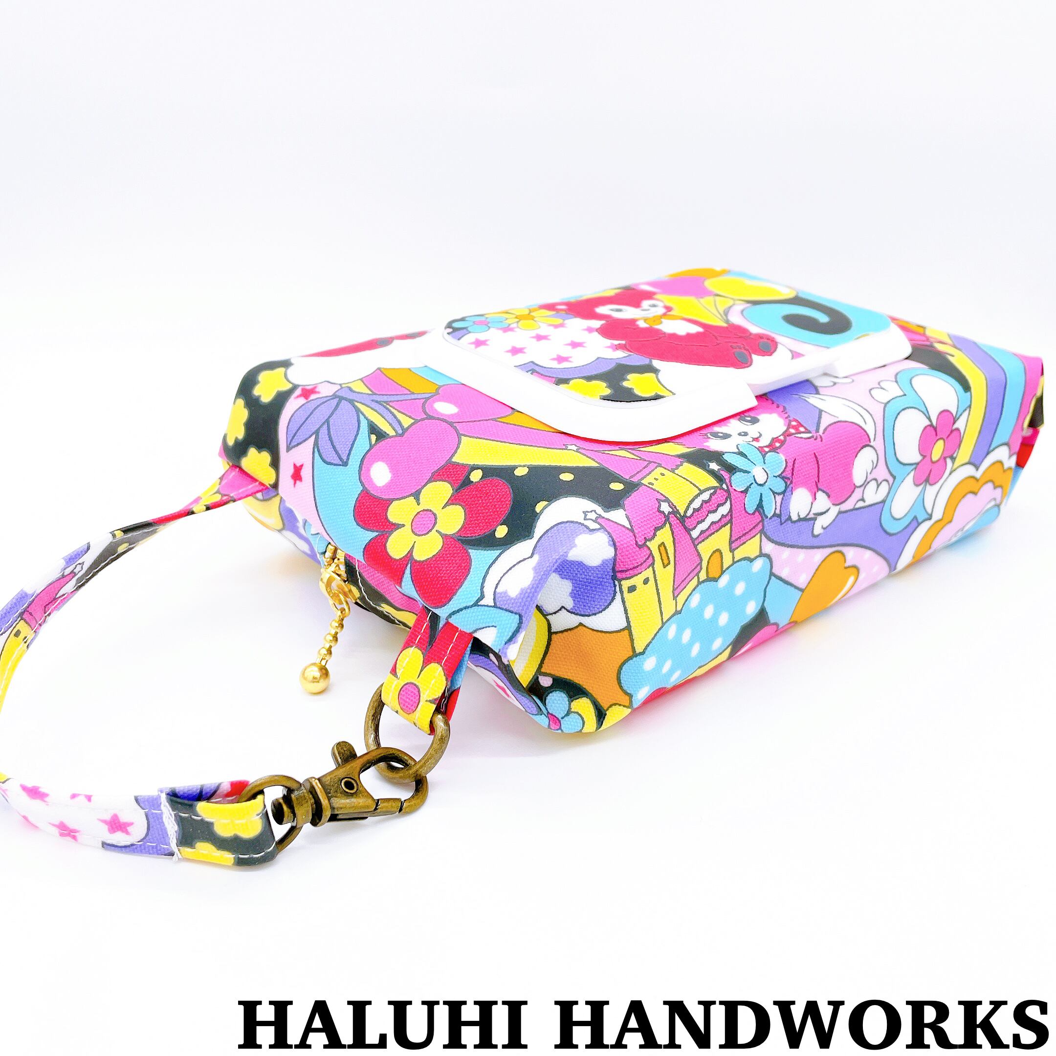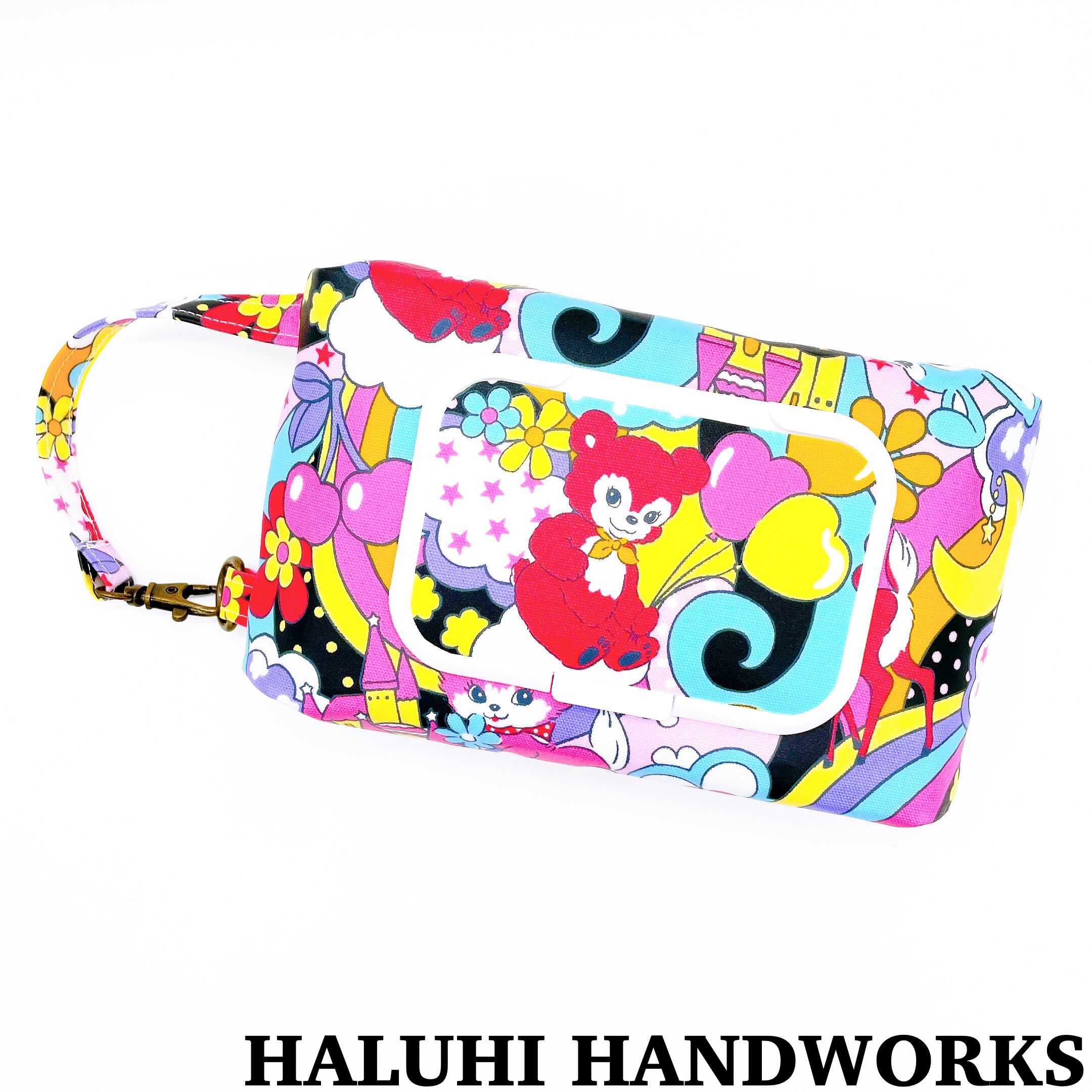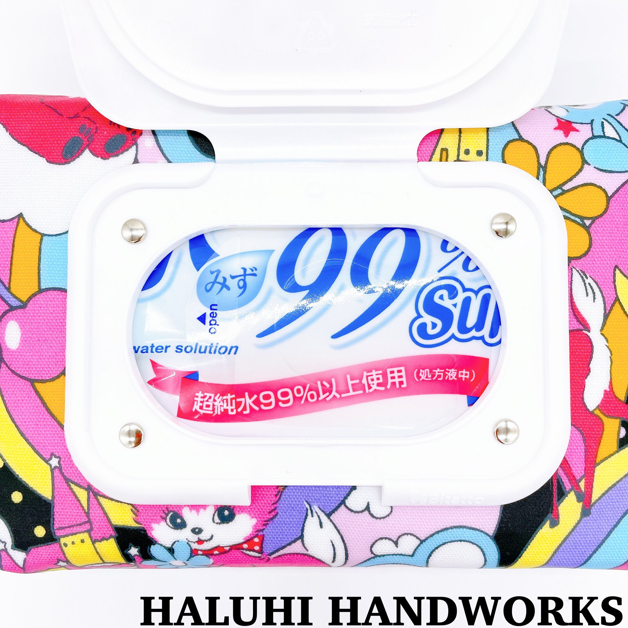 女の子が大好きなモチーフがたくさん詰まった、とってもかわいいファンシーアニマルのラミネート生地で作ったおしりふきポーチになります。