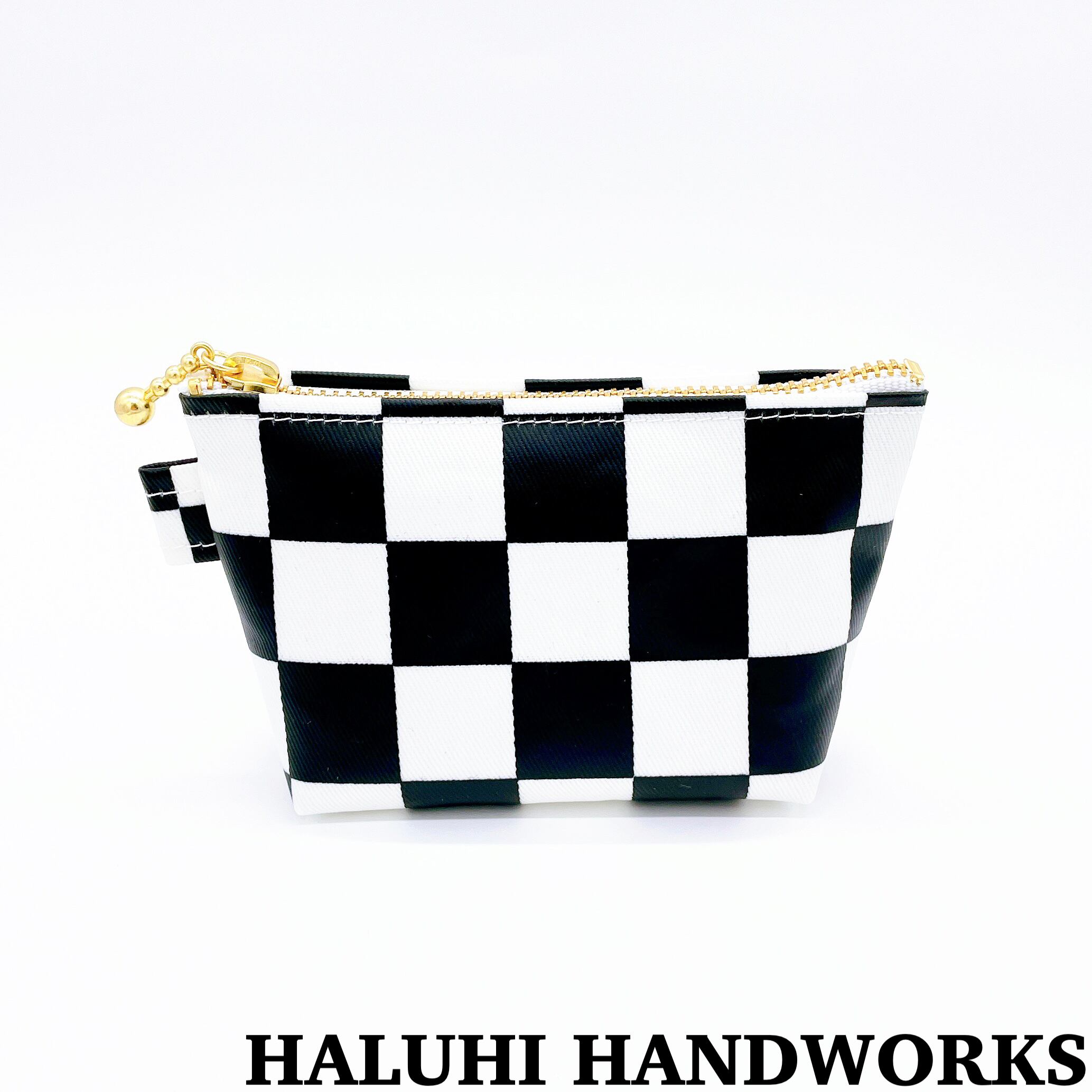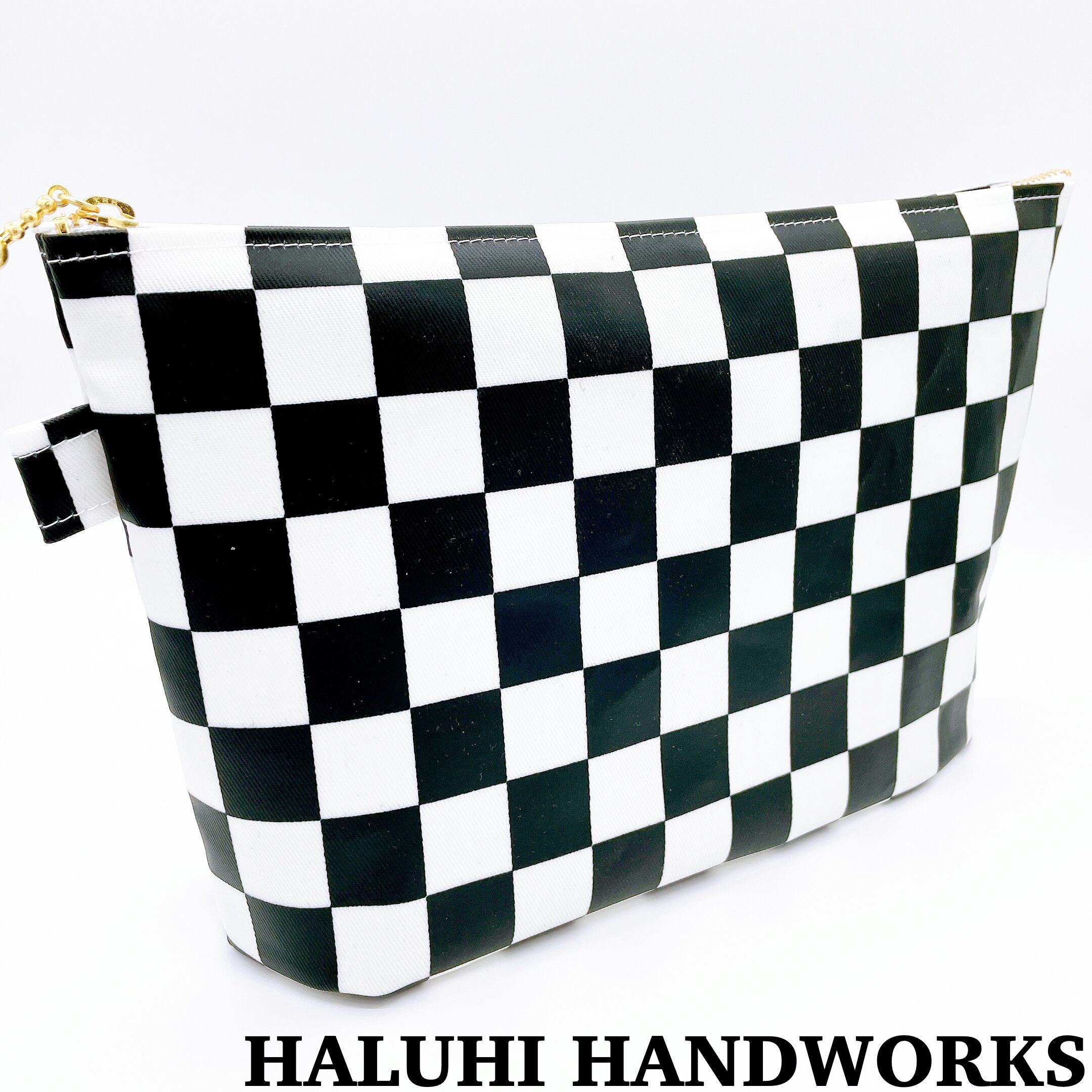 チェッカーフラッグのラミネート生地で作った台形ポーチになります。
