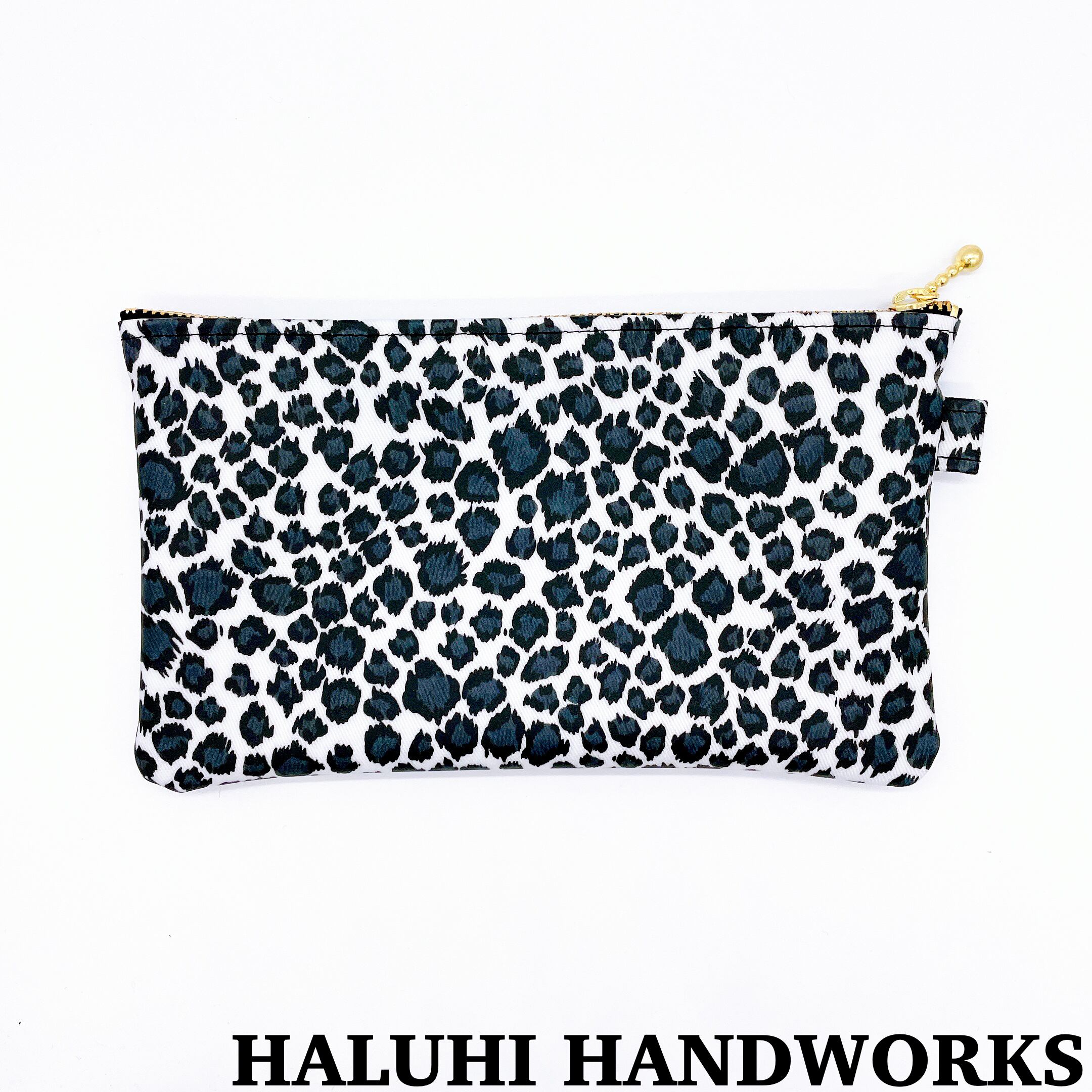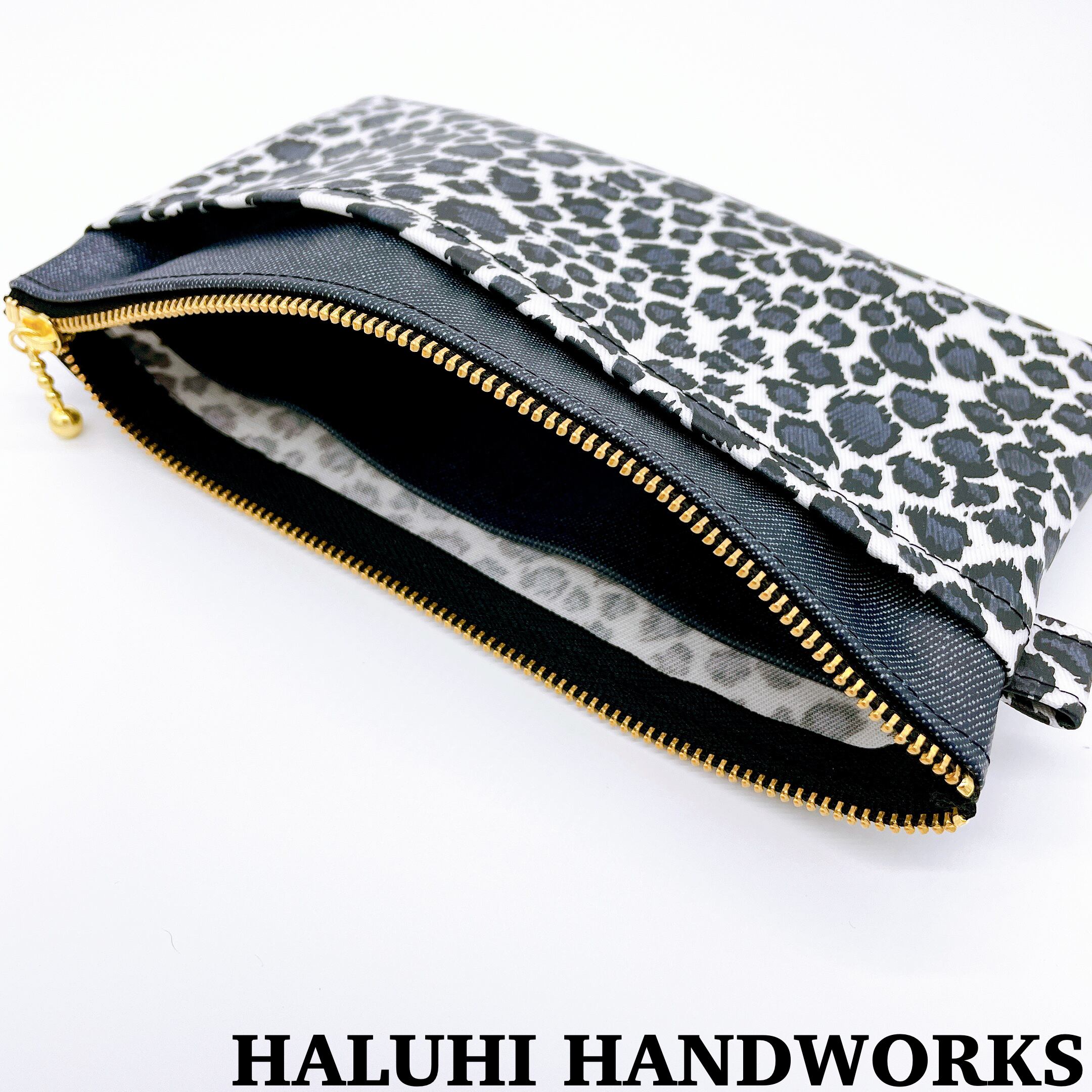 ヒョウ柄×デニムのラミネート生地で作った通帳ポーチになります。