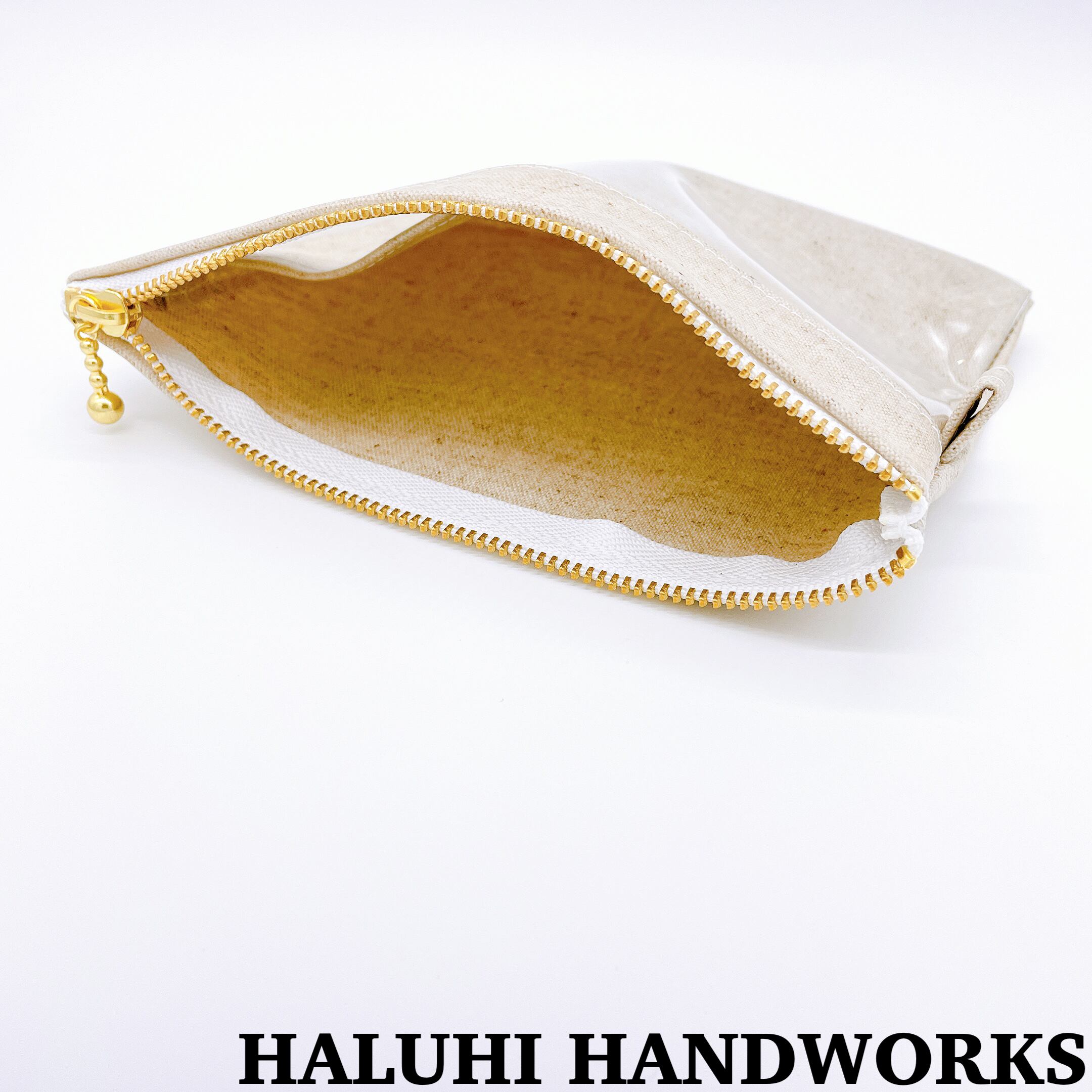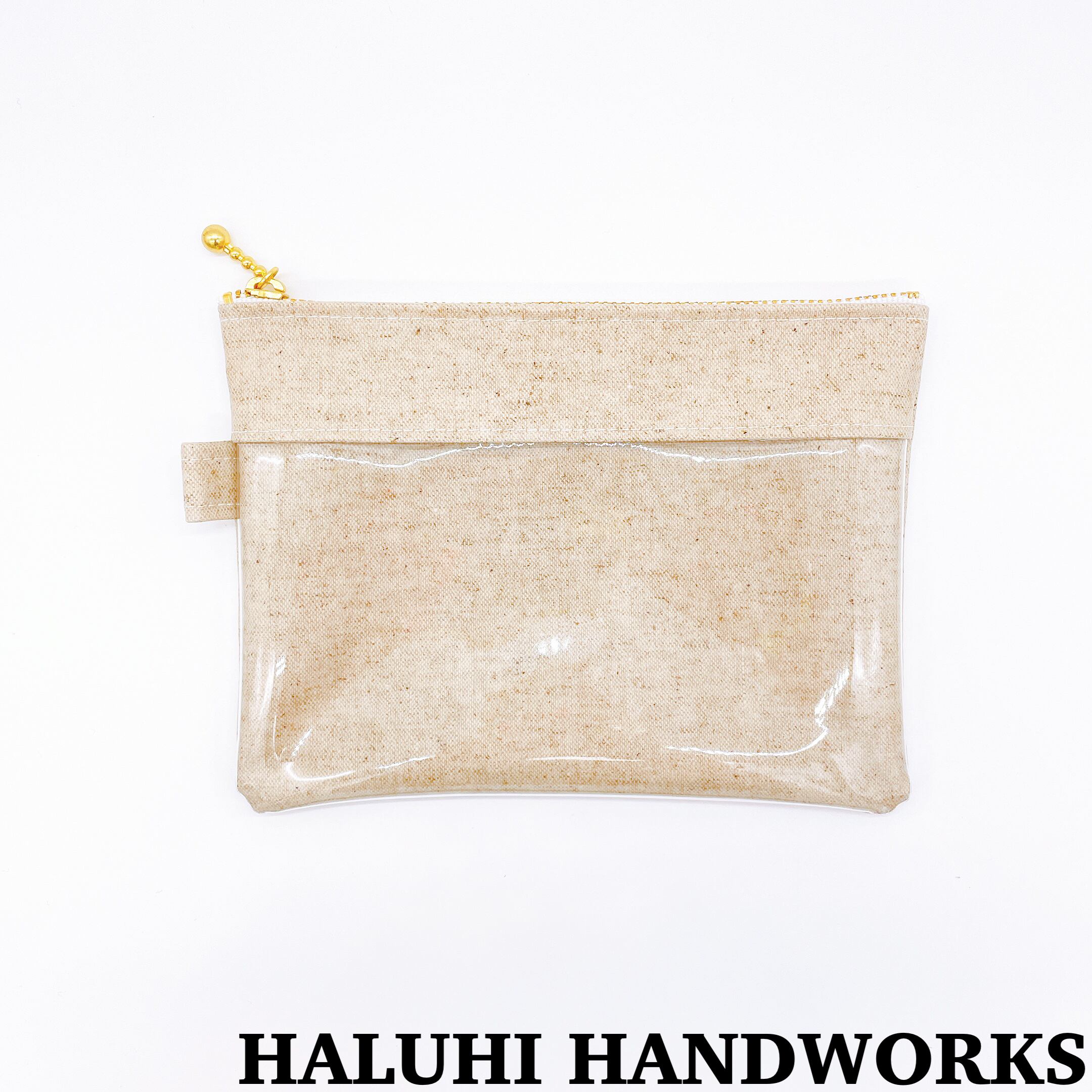 シンプル無地ラミネート生地×クリアPVCを使って作ったポーチになります。