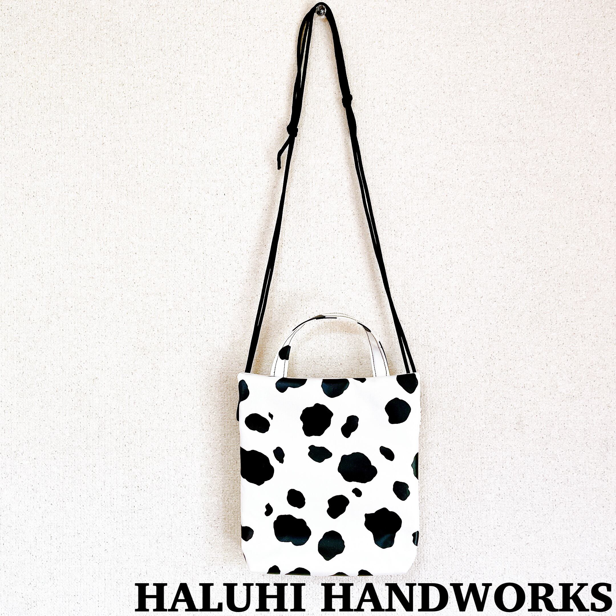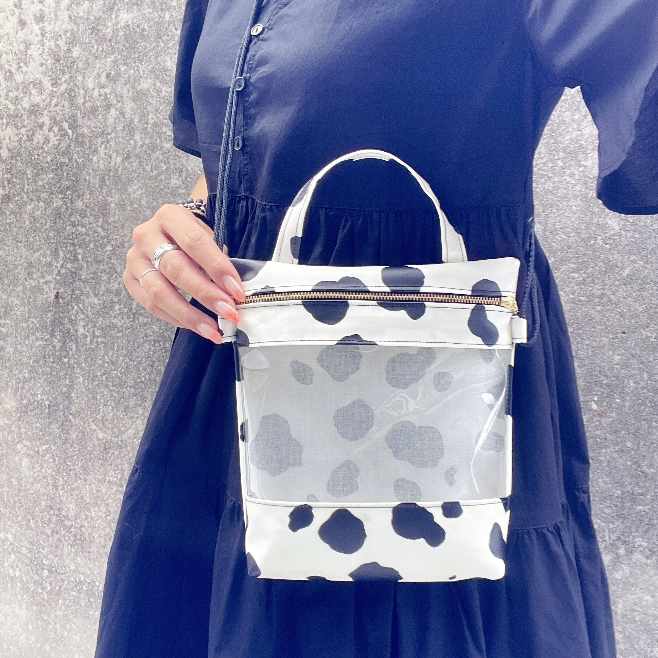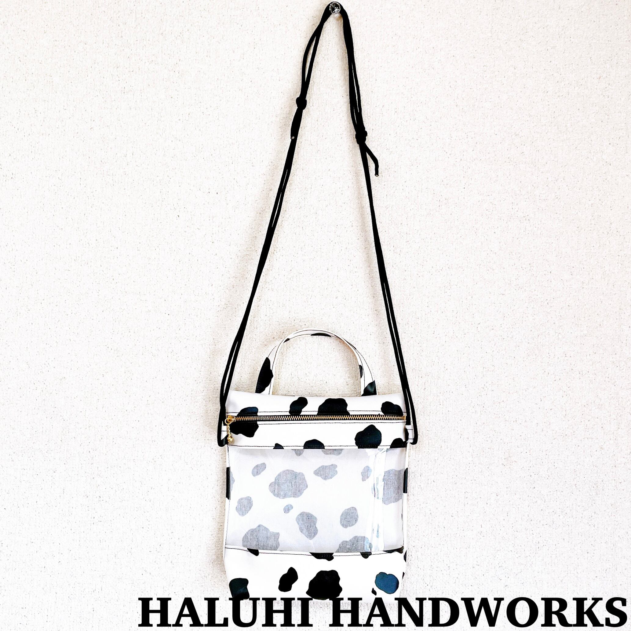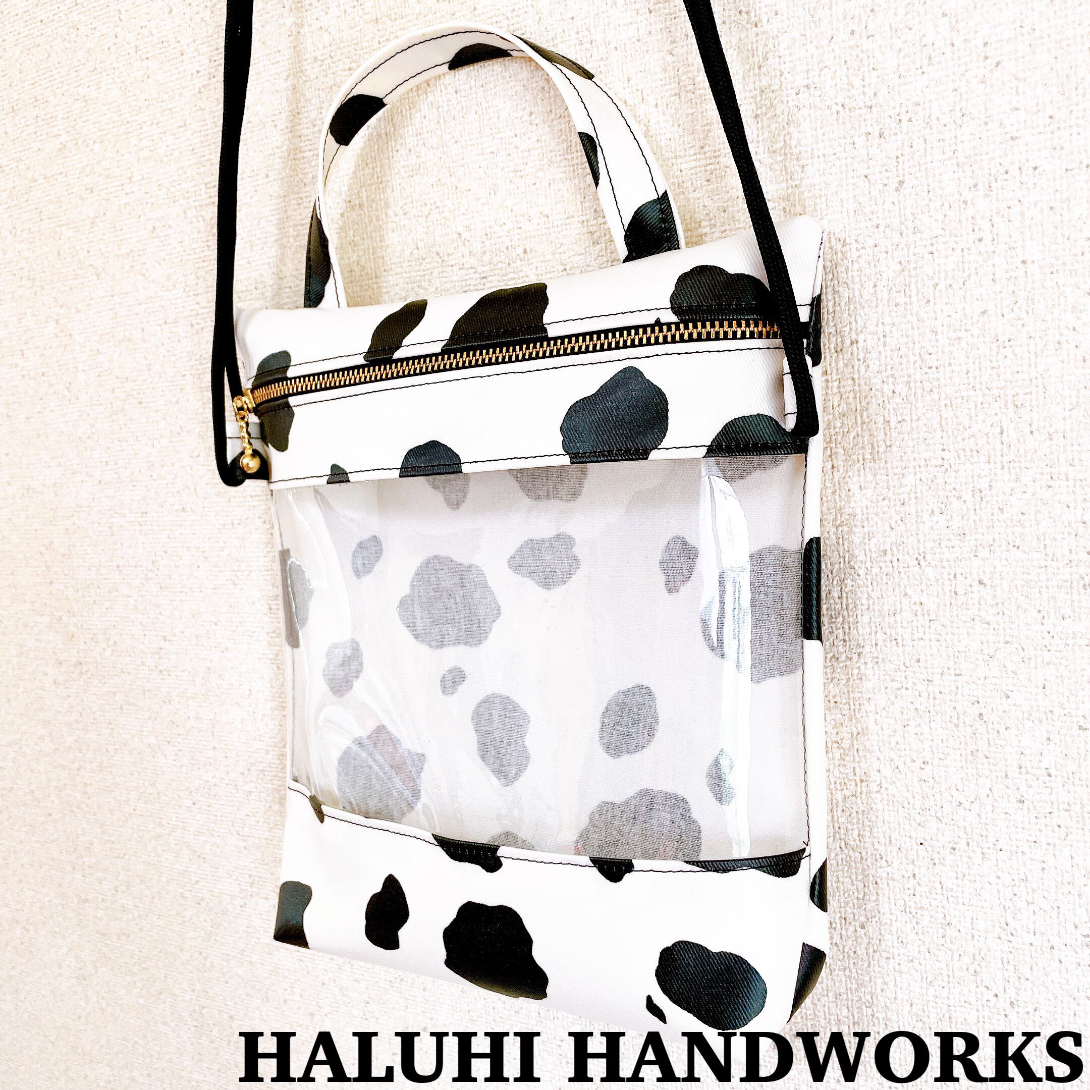 人気の牛柄ラミネート生地とクリアのビニール生地で作ったショルダーバッグになります。