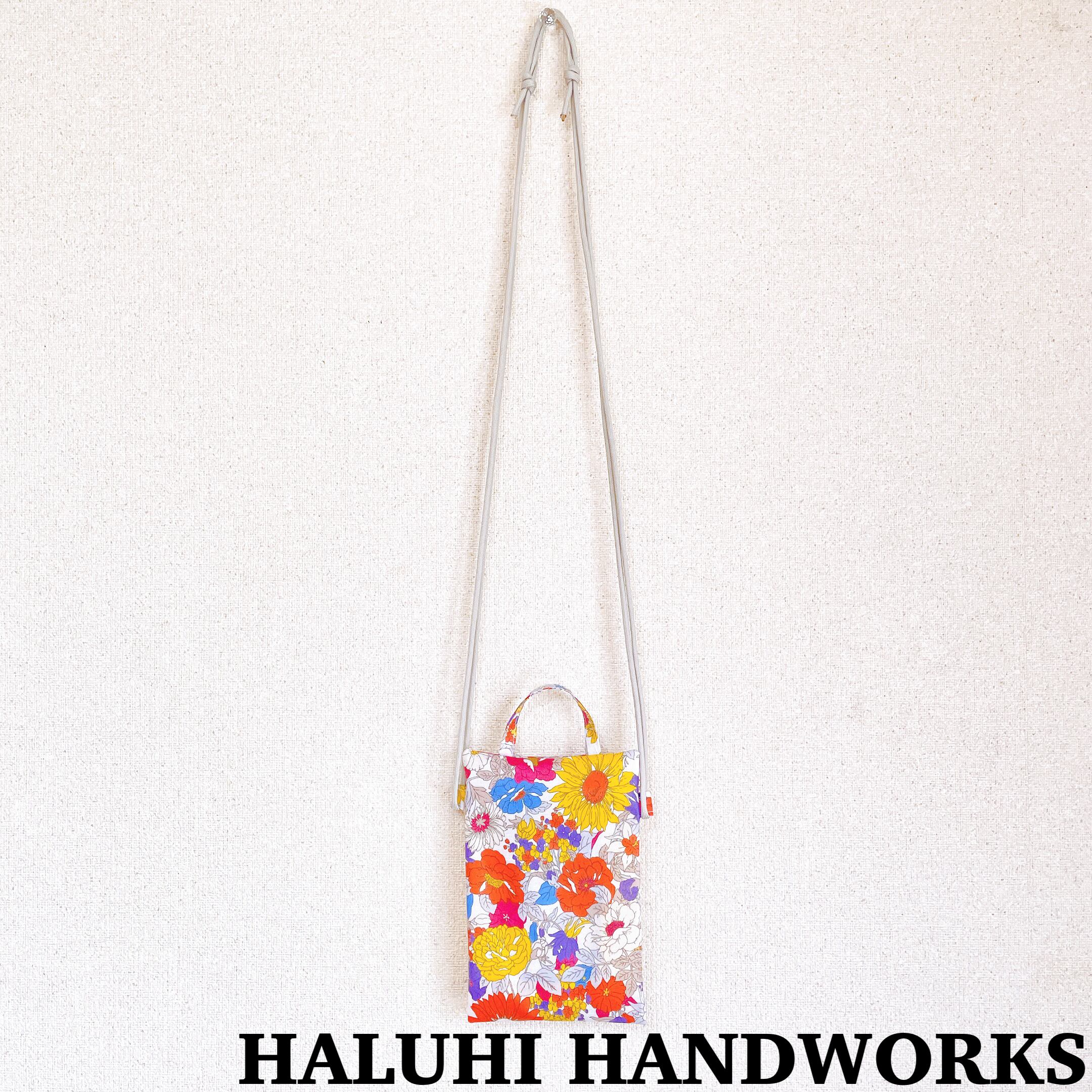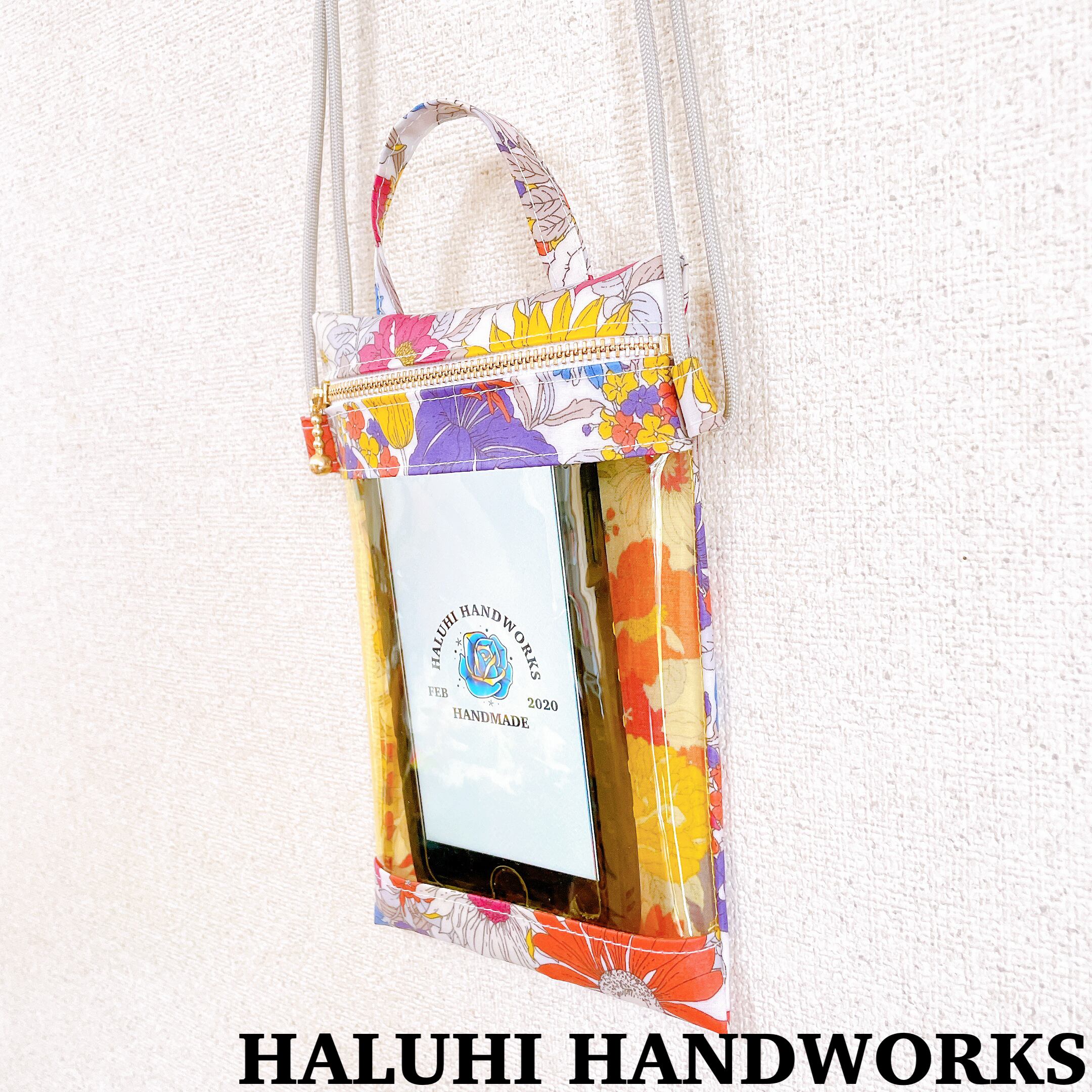 アートフラワーのラミネート生地とクリアのビニール生地で作ったスマホショルダー、ミニバッグになります。